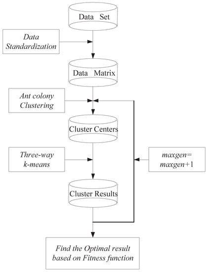 Because the clustering results of the standard three-way k-means algorithm depend on the selection of initial centers they easily succumb to the problem of local optimization. To overcome this problem, this paper presents an improved three-way k-means algorithm by integrating the ant colony algorithm and three-way k-means. An original element of this paper is the application of clustering centers obtained by the ant colony algorithm to the three-way k-means, which makes up for the shortcomings of the three-way k-means clustering algorithm due to the random selection of clustering centers. Figure 3 presents a flowchart of the proposed algorithm.