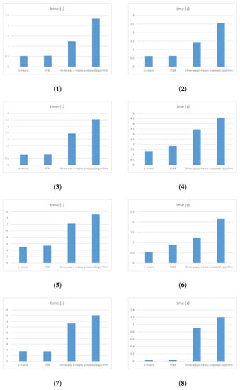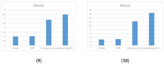The running time of the proposed algorithm is much longer than k-means and FCM on all the UCI datasets, as shown in Figure 4. This is because the time complexity of the proposed algorithm is much more than that of k-means and FCM. Compared with the three-way k-means method, the proposed algorithm takes slightly longer. This is because the proposed algorithm integrates the ant colony algorithm into three-way k-means, which adds to the running time of the proposed algorithm.