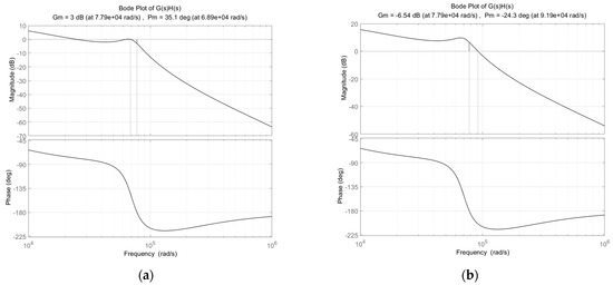 Bode plot of loop gain G(s)H(s) for different load impedances (Kf = 0.97): (a) LCM = 0.5 mH; (b) LCM = 1.5 mH.