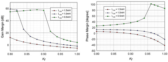 Figure 11 shows the gain and phase margins for the different CM choke inductances. It is shown in this figure that the phase margin is zero at the DC gain Kf = 0.89 for LCM = 1.5 mH, and this DC gain is theoretically the maximum for the stable operation of the AEF with the given parameters. The maximum applicable value of Kf is decreased as the CM choke inductance LCM increases. The maximum value of Kf to ensure the stable operation is 0.97 for LCM = 1.0 mH and the AEF is stable for all Kf values for LCM = 0.5 mH. It is noted in the results of the stability analysis for the load impedance that the sufficiently low value of the impedance can improve the range of the stable operation for the AEF with the high AEF gain.