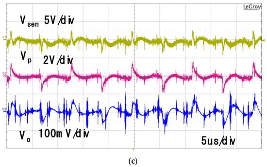 Figure 14 shows the experimental waveforms for the actual feedforward AEF shown in Figure 13. The sensed noise voltage (Vsen), output voltage of the operational amplifier (Vp) and voltage measured at the LISN terminal (Vo), where the DC gain Kf of the AEF are 0.94, 0.96 and 0.98, respectively. The performance of the noise reduction for the AEF can be determined by the voltage measured at the LISN terminal. As shown in Figure 14a,b, the output voltages of the operational amplifier (Vp) are matched with the sensed noise voltages (Vsen) for the DC gain Kf of 0.94 and 0.96. The high frequency noise only remains in the voltage Vo measured at the LISN terminal. This means that the AEF operation is stable and the noise cancellation is well performed for these gains. It is, however, shown in Figure 14c that the voltage Vp does not follow the sensed voltage (Vsen) for the DC gain Kf of 0.98 and the low frequency noise voltage is shown in the LISN voltage Vo. It is, therefore, noted in this figure that the noise cancellation is not properly performed for this gain. This is because of the unstable operation of the AEF.