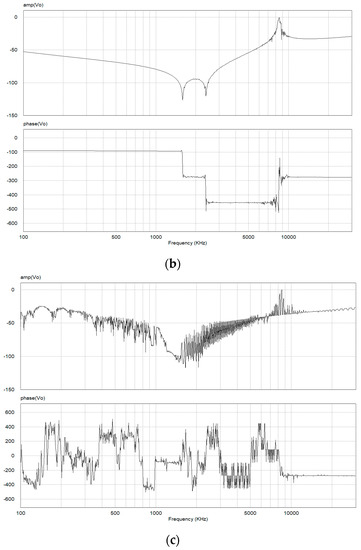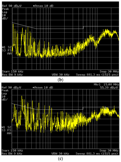 Figure 15 shows the frequency response for the ratio of the noise attenuation given in (16) for the three DC gains Kf of 0.94, 0.94 and 0.98, respectively. It is noted in Figure 15c that the noise attenuation of the AEF is not properly done because of the unstable operation of the AEF. Figure 16 shows the EMI spectrums measured at the LISN terminal for the above three DC gains, where the limit line is for the EN55022 regulation. It is shown in Figure 16a,b that the EMI attenuation is well performed in the entire test frequency range of 150 kHz to 30 MHz. In particular, the all frequency components are below the limit line for the DC gain Kf = 0.96. It is known in this result that the EMI reduction performance of the AEF for Kf = 0.96 is better than that for Kf = 0.94. Ideally, the noise voltage decreases to zero as the Kf approaches the unity. However, this is only possible under the stable operation of the AEF. It is shown in Figure 16c that the noise voltage is not properly attenuated for the DC gain Kf = 0.98. As discussed for the results shown in Figure 14 and Figure 15, the AEF is unstable for this gain and the noise attenuation performance is severely degraded for nearly the entire test frequency range of 150 kHz to 30 MHz. It is known, therefore, in Figure 14, Figure 15 and Figure 16 that the DC gain of the AEF should be selected to guarantee the stable operation of the AEF.