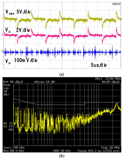 As shown in Figure 11, the maximum value of the DC gain depends on the source and load impedances. The higher value of Kf can be applied to the AEF if the CM choke with the lower inductance is used. Figure 17 shows the experimental waveforms for the AEF with the CM choke inductance of LCM = 0.5 mH, where Kf = 0.99. Since the CM choke inductance is reduced to 0.5 mH, the stable range for Kf is extended to the unity as shown in Figure 11, and thus the DC gain of Kf = 0.99 can be applied. It is shown in this experimental result that the noise reduction performance of the AEF is improved because of the higher value of the Kf applied, as shown in the EMI spectrum of the low frequency range of 150 kHz to 500 kHz in Figure 17b. However, the EMI reduction performance of the high frequency range is worse than the that of the AEF with the CM choke inductance of 1 mH. This is because the smaller CM choke is applied and the noise reduction effect by the CM choke thus is degraded. It, therefore, should be required to select the optimum values of both DC gain Kf and CM choke inductance for the best EMI performance. This can be considered as an important issue for further studies.