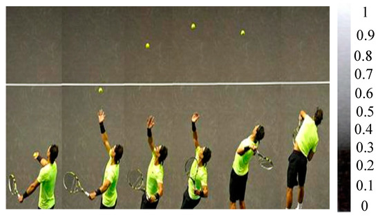 The forward motion intensity distribution of the edge contour feature under the human body dynamics model is used in the recognition of the image during the tennis playing process [16,17,18,19,20,21]. When the athlete’s elbow is gradually straightened and approaching downward, the ball rotates in the air, and the probability density function of the position distribution in the air after the ball is released from the hand is: