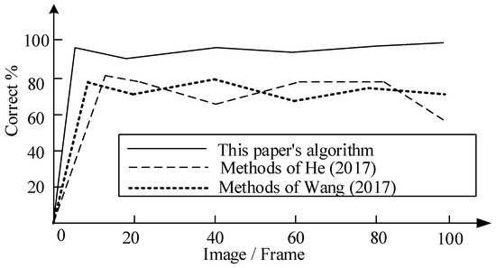 It can be seen from Figure 5 that the correction accuracy of the method in reference [8] is 73%, that of the method in reference [9] is 76%, and that of the proposed algorithm is 95%. The correction accuracy of the proposed algorithm is 22%higher than that of the method in reference [8] and 19% higher than that of the method in reference [9]. With the increase of the number of image frames, the correction accuracy of the proposed algorithm is gradually improved, and the change is stable, which meets the requirements of the correction accuracy of tennis serve video images.