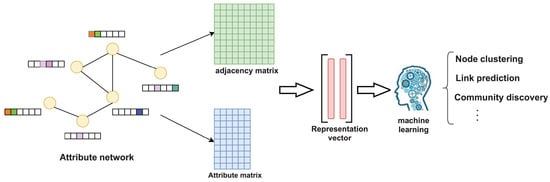 The purpose of attribute network representation learning is to use the network structure and node attribute information to learn a mapping function on a given attribute network and map the nodes in the network to a low-dimensional vector space so that the nodes with similar structures and attributes are close to each other in the low-dimensional space, and then use machine learning methods to solve the downstream tasks in network analysis, such as node clustering and link prediction. The attribute network represents the learning process, as shown in Figure 2. The adjacency matrix and attribute matrix of the attribute network are combined to learn the final representation vector of nodes. The low-dimensional representation vector is applied in the machine learning algorithm to solve the downstream tasks of network analysis, such as node clustering and link prediction. To use a symbolic expression to explain attribute network representation learning, for a given attribute network, learn the mapping function and , where the mapping is associated with the structure and attribute information of each node, where d is the dimension of the final representation vector of nodes.