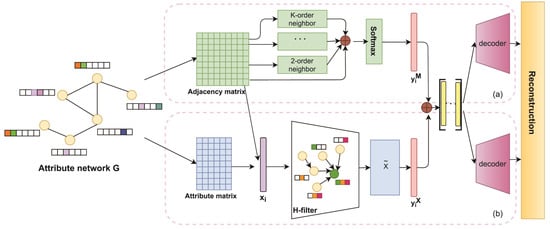 Traditional network representation learning methods are dedicated to retaining the topological structure information of the network [1,2,3], while the vast majority of real networks contain rich attribute information, such as hobbies, addresses, and ages of users in social networks, authors, keywords, and research fields of articles in citation networks, and such networks are called attribute networks [12,15,21]. When the network is highly sparse, the attribute information of nodes is important auxiliary information for network representation and helps to learn better network representation; if two nodes do not have a similar network structure, but have the same attributes, they should also have similar representation in the final representation space [22,23].