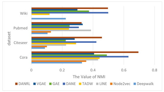 The node clustering task accuracy and NMI experimental results are shown in Table 4, where the bolded values are the results of the algorithm DANRL in this paper, the underlined ones are the optimal results, and “−” indicates no experimental results. Because the NMI results of node2vec and LINE algorithms for clustering tasks on the Wiki dataset are poor, they are not presented, and the NMI results of the AANE algorithm on the Pubmed and Wiki datasets are unstable, so they are not compared. For the Cora dataset, the precision of the DANRL algorithm is 0.775, which is 7.3% better than the 0.702 of the suboptimal DANE algorithm. For the Wiki dataset, the precision and NMI of the optimal results are 0.473 and 0.499, respectively, which are slightly higher than the 0.468 and 0.497 of the DANRL algorithm, but the DANRL algorithm is close to the optimal results. For the Citeseer dataset, the DANRL accuracy and NMI are 0.705 and 0.458, which are significantly higher than the suboptimal results of 0.479 and 0.422 in other algorithms, with an improvement of nearly 23% and 3%. This proves that the algorithm in this paper has better performance on the clustering task.