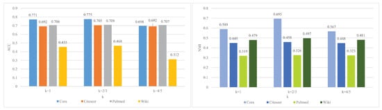 Figure 6 shows the experimental results for different k values. The left graph clusters ACC metrics and the right graph shows clustering NMI metrics. In the left panel, the vertical axis indicates the clustering accuracy, and the horizontal axis indicates different k values. The ACC metrics of Cora and Citeseer networks are optimal when , and the difference between the results on Pubmed and Wiki networks and is not very obvious, but from to and , ACC is optimal at the place closest to the inverse of the maximum eigenvalue of each network (i.e., ). In the right panel, the vertical axis is the clustered NMI values, the horizontal axis is the different k values, and the four colors are the four data sets. At , most of the histograms are the highest, and only the light green and dark blue results do not differ much at different k values, proving that the low-pass filter designed in this paper is an improvement over the traditional convolution operation.