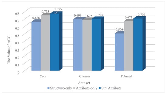 To verify the effectiveness of the method proposed in this paper, the variant model was set up with the same parameter settings as shown in Table 3, and the experimental results are shown in Table 6, where the bolded values are the results of the method proposed in this paper. For the Citeseer dataset, the accuracy of the dual autoencoders is 0.705, and the accuracies of the variant models are 0.699 and 0.692, and the model in this paper is improved by nearly 1 percentage point. For the Cora and Pubmed datasets, the accuracy of only the structure encoder (i.e., M) is 0.666 and 0.506, respectively, and the results are much worse than the accuracy of the dual encoders, 0.775 and 0.709, but the accuracy of only the attribute encoder (i.e., X) is 0.753 and 0.673, and the results are better than those of the other variant model, indicating that the network structure and attribute information for different datasets have different levels of importance. Compared with the first two model variants, the accuracies are 0.775, 0.705, and 0.709 on the three data sets, which are all improved and prove the superiority of the model in this paper.