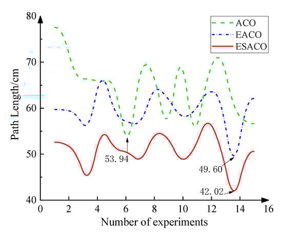In the present study, the elite formulation and smoothing method are used to optimize the algorithm twice. Therefore, the improved algorithms are called EACO and ESACO. In order to ensure the accuracy of the experiment, the parameters of the three algorithms are set uniformly. By referring to the parameter range in other citations, considering other researchers’ settings, and trying a variety of combination simulations, the parameter combination with the best experimental results is finally determined as: and the newly set parameters are taken as follows:. In addition, considering the randomness of the algorithm, the three algorithms before and after the improvement are carried out 15 times for path planning with obstacles in the scene to test the effectiveness of the algorithm. The following indicators are used to evaluate the symmetry performance of ACO, EACO, and ESACO. Table 4 presents the recorded results.