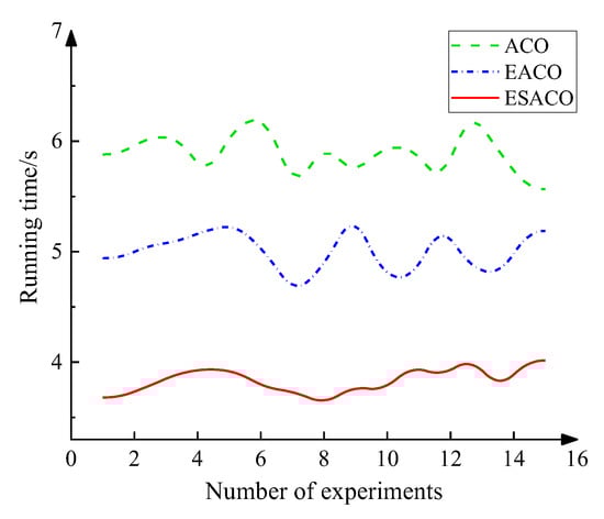 Figure 5 shows the trend of the running time, indicating shorter runtimes after each improvement. Table 5 shows that the average running time is reduced from 5.897 s to 4.994 s to 3.831 s, and the optimized values are 15.3% and 35% shorter than the original one. The standard deviations are 0.150, 0.158, and 0.101, respectively. The obtained results show that the lowest value can be achieved using the ESACO algorithm.