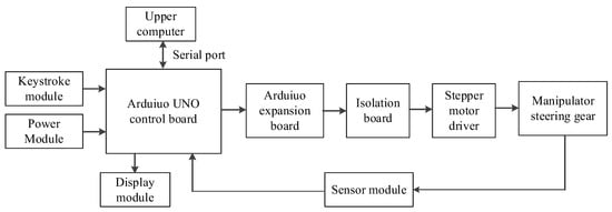 In this section, the Arduino Uno microcontroller is utilized to generate the dynamic system of the manipulator. The control system of the grasping manipulator includes a key module, a power module, a display module, and an Arduino control module. The Arduino control board acts on the stepper motor drive module, which drives the steering gear of the manipulator to form a closed control system. Finally, the multi-angle-free and accurate movement of the manipulator is realized through system debugging. The structure diagram of the control system is presented in Figure 6.