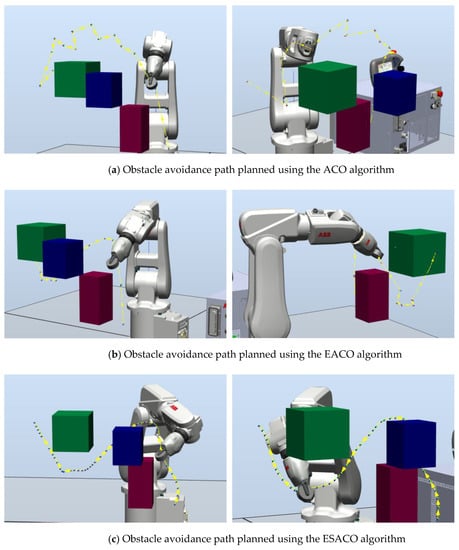 Obstacle avoidance paths using ACO, EACO, and ESACO algorithms.