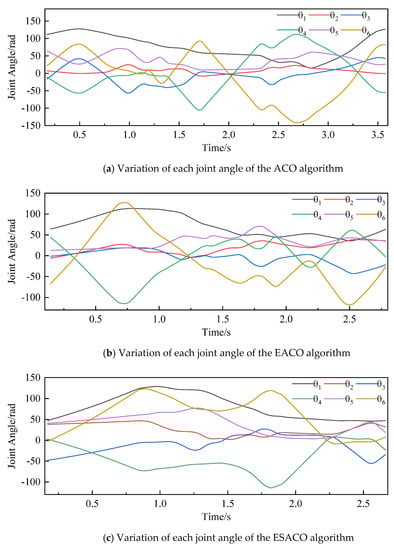 Inverse kinematics is the process of solving for all joint variables given the pose of the end of the manipulator. Figure 9 shows the variation of each joint angle during obstacle avoidance for the three algorithms. It is observed that the variation of each joint in the ACO and EACO algorithms is larger than that in the ESACO algorithm, which indicates the relatively stable motion of the mechanical arm in the ESACO algorithm.