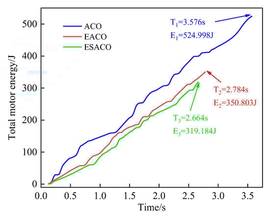 Figure 10 shows the total energy variation of the grasping mechanical arm, indicating that the manipulator completes the path in 3.576 s with total motor energy of 524.998 J when using the ACO algorithm, 2.784 s with total motor energy of 350.803 J when using the EACO algorithm, and 2.664 s with total motor energy of 319.184 J when using the ESACO algorithm. This shows that among the studied algorithms, ESACO can complete the path in the shortest time and the least energy consumption during the assembly process with good symmetry.