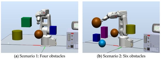 In order to further verify the effectiveness of the proposed algorithm for obstacle avoidance path planning of the grasping manipulator, two scenarios with different shapes and different obstacles are set up. Then each algorithm is tested 15 times. Figure 11a,b shows the scenario with four and six obstacles, respectively. Table 7 shows the experimental results for different scenarios.