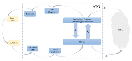 As can be seen from Figure 2, for the multiple high-speed trains control system, we first sample the state of train at a fixed time interval to obtain the state quantity . Then, is obtained through the state observer, and the state transition matrix is introduced, which can obtain . Set the specific triggering function in advance at the event-triggered processor. is transmitted to the event-triggered processor. If the data satisfy the event-triggered conditions, the sampled data will be transmitted to the other trains through the radio block center (RBC), and it will also be transmitted to the data store of the train to update the information. In contrast, if the data do not satisfy the trigger conditions, then the data will not be transmitted. The data store also received data from the other trains all of the time, referred to in the paper as . After receiving data from other trains, the data store sends the data to the event-triggered processor. It can be seen that the data of the other train and the data of train are used to determine the trigger conditions. Since the data of the train can be transmitted to the controller only when triggering conditions are met, the update of controller is also triggered by “events”. During the time interval between triggers, the input to the control remains constant and so does the control output.