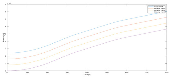 The ideal distance between any two trains is 8000 m. Set ,. The initial states of the leader train and the follower trains are set. The initial state of the leader train is , and the initial states of the follower train is ,, and .
