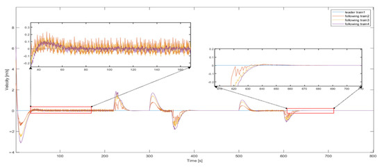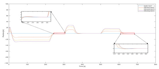 Figure 4 and Figure 5, respectively, show the results of the trains’ position tracking. According to the picture, the position error of the train is in the range of , which meets the objective of . Figure 6 and Figure 7, respectively, show the result of the speed tracking of the trains. It can be seen that, when the acceleration of the leader train exists or switches, a certain speed tracking error will be generated. The error range of train speed is between , which meets the target of setting in advance. The following conclusions can be drawn: in the process of operation, the speed of the tracking train can be consistent with the speed of the leader train, and the position error and speed error can converge to 0 eventually, so that the system can achieve the goal of asymptotic stability.