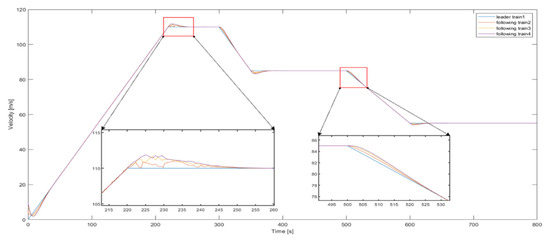 This section uses MATLAB software for simulation verification. The relevant parameters of the multiple high-speed trains system are set as follows [54]. According to the system model, , , and . The mass of each train is . Set , , and . In the operation of the train by the additional resistance . In the simulation verification process, the acceleration of the leader train is set to
