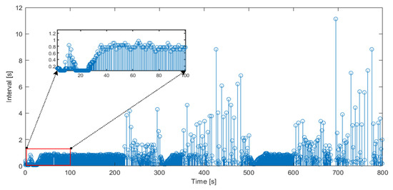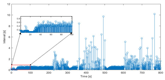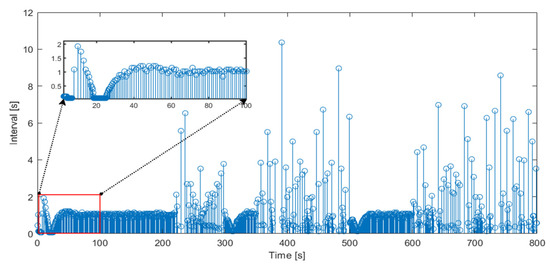 In the simulation process, the sampling interval is set to 0.064 s. If the train status information is transmitted in a time-triggered manner, the information of the follower train will be transmitted for 12,500 times and the same number of controller updates will be completed. After the event-triggered mechanism is introduced, the event-triggered time and trigger interval of the follower train are shown in Figure 8, Figure 9 and Figure 10. According to the simulation results, train 2, train 3, and train 4 are triggered 889, 1192, and 1705 times, respectively, within 800 s. According to the analysis of train 4 with the most times of triggering, under the event-triggered mechanism, the state information transmission and controller update times of train 4 are greatly reduced, which is only 14% of that under the traditional time- trigger mode. It can be seen from the enlarged area in the simulation results that the trigger frequency is high and the interval is small within 30 s after the start of operation. When the train speed tends to be consistent, the trigger frequency will be relatively low, and the interval will become larger.