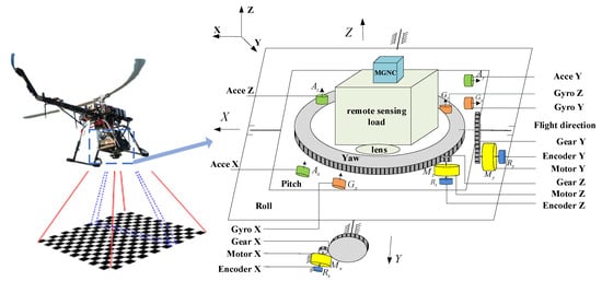 The schematic diagram of the three-axis ISP is shown in Figure 1, which is composed of the roll gimbal, pitch gimbal, and yaw gimbal. The roll gimbal is located at the outermost gimbal, fixed on the base by the shock absorbers. The pitch gimbal is adjacent to the roll gimbal, and the yaw gimbal is located in the innermost gimbal, carrying the remote sensing load. The frame structure of the ISP is symmetrically distributed from the inside to the outside, which ensures the stability of the LOS in the mechanical structure. The high-performance micro-guidance navigation control (MGNC) unit is installed on the top of the remote sensing load, which has the same base as the remote sensing load. Therefore, it can sample the pointing accuracy of the LOS of the remote sensing load in the geographic coordinate system and generate the corresponding control commands to isolate non-ideal disturbances. In order to achieve a high precision and a fast response control, the driving mechanisms of ISP are mainly composed of the brushless DC motors and wire gear drive systems. Based on the commands of the MGNC unit, the remote sensing load is adjusted correspondingly.