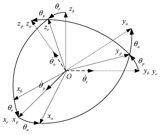In the ISP system, each frame is driven by a motor, that is, each frame has only one degree of freedom, and the pitch and roll angles of the yaw frame are indirectly generated by the pitch and roll frames, so and hold if, and only if, and . Since in the actual ISP system, the control target and the measurement datum are both on the yaw coordinate, should become , so it is also necessary to transform the formulas (A2) and (A3):