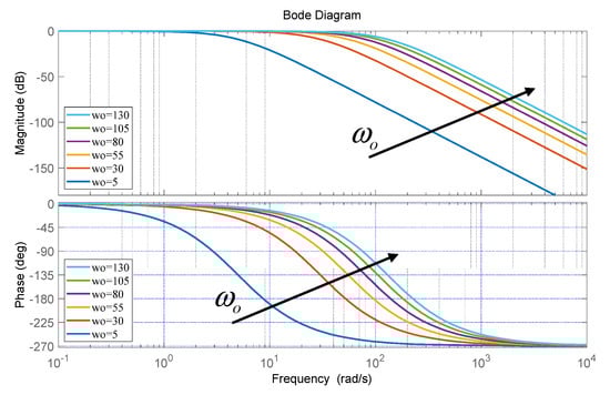 The frequency response of is shown in Figure 4. It can be seen that as the frequency of the disturbance increases, the estimation of the disturbance by LESO exhibits obvious phase lag and amplitude attenuation. The decrease in the disturbance estimation accuracy will result in a decrease in the control performance. Although increasing the observation bandwidth can improve the estimation ability of LESO, it will also introduce more high-frequency noise, which will weaken the system’s resistance to high-frequency noise.