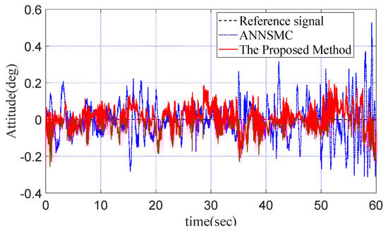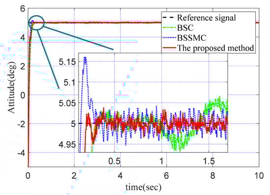 Figure 6 shows the comparison of the attitude angles generated by the three control methods. When the simulation time reaches 0.3 s, the attitude angles of the three control methods can all track the desired attitude angles, and there exists a peaking value in the initial stage of the BSSMC, which reaches 5.1609°. Compared with the other two control methods, the proposed control method has the best performance both in terms of response speed and robustness to disturbances, and the angle velocity of the proposed control method can reach . In order to intuitively reflect the control performance of the three control methods, the root mean square error (RMSE), the integral of time-multiplied absolute-value of error (ITAE), and the maximum deviation of error (MAXE) are used as the performance indicators of the tracking error.