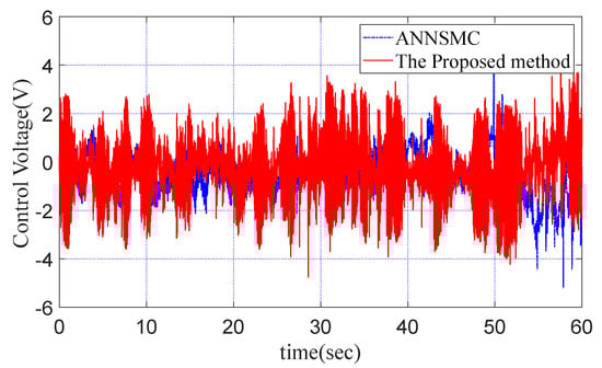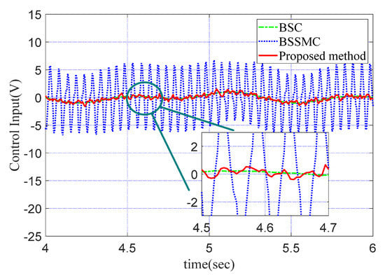 Figure 7 shows the comparison of the control voltages generated by the three control methods. Compared with the other two control methods, BSSMC has an obvious chattering problem, which is very disadvantageous to the actuator of the ISP system. The proposed control solves the chattering problem, and the peak voltage is only 1/4 of that of the BSSMC, which will keep the ISP system running longer.