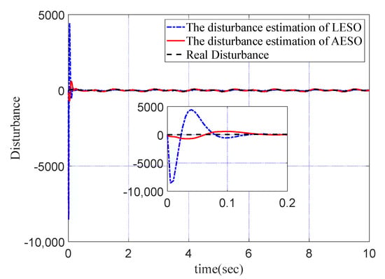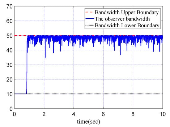 Figure 8, Figure 9 and Figure 10 show the simulation results for LESO and AESO. When the simulation time reaches 0.15 s, the disturbance estimations can track the real disturbance. Compared with LESO, there is no peaking phenomenon in AESO, and the disturbance estimation curve is more convergent. The maximum peak of estimation of AESO is only 8.09% of that of the LESO. In addition, the maximum disturbance estimation error of AESO is only 40% of that of the LESO. It can be seen from Figure 10 that the bandwidth variation of AESO guarantees the accuracy of AESO disturbance estimation.