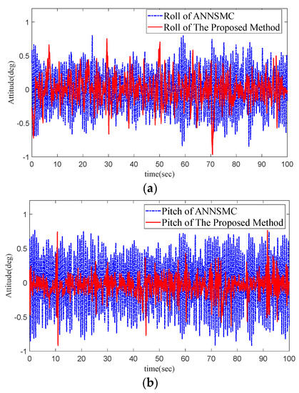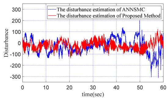 As can be seen from Table 4, compared with the ANNSMC, the RMSE values and ITAE values of the proposed method are improved by at least 32.3% and 32.9%, respectively. However, the MAXE value of the roll gimbal of the proposed method is increased by 14.0%. Additionally, the MAXE values of the pitch gimbal and yaw gimbal of the proposed method are improved by 0.36% and 36.3%, respectively. Therefore, the proposed method has strong robustness against disturbances, which can achieve better control performance than ANNSMC.