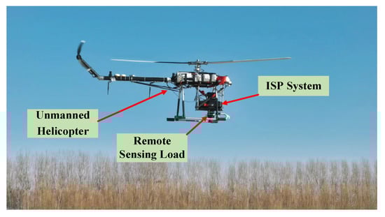 To test the control performance of the proposed method in actual flight, a series of airport pavement inspections have been conducted in Tianjin city from August 2020 to February 2021. The unmanned helicopter inspection system is shown in Figure 16. Due to the consideration of counterweight, the ISP system was hung by four carbon fiber columns at the front abdomen of the unmanned helicopter.