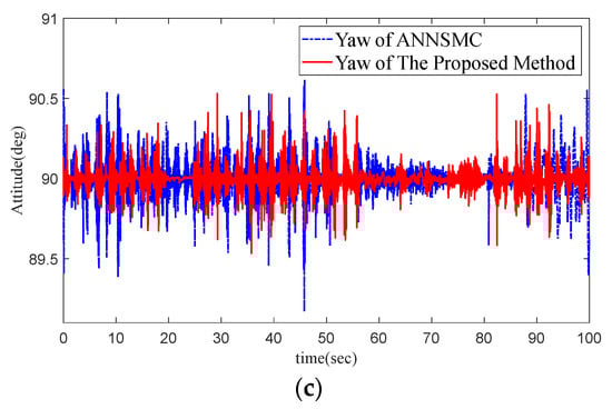 (a) Roll angle, (b) Pitch angle, (c) Yaw angle. The comparison of the attitude angles generated by the two control methods of the flight experiment.