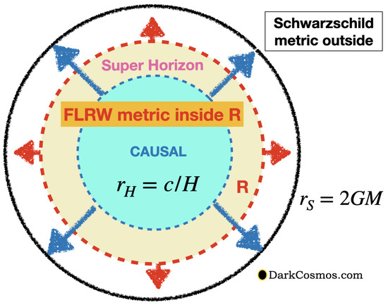 where and . We can now define the corresponding Schwarzschild radius GM and ask the following question: is ? If the answer is yes, then the FLRW* is inside its own gravitational radius and the FLRW* metric corresponds to the interior of a BH, which we call the Black Hole Universe (BHU). We will later see in Section 3 that this indeed is the situation that corresponds to our observed Universe.