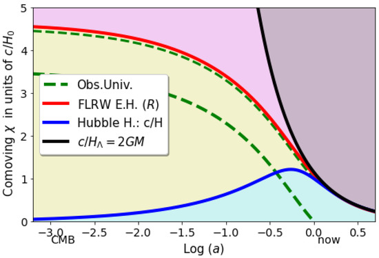 where is the corresponding co-moving scale. This is the maximum distance ever travel by a photon (outgoing radial null geodesic or Event Horizon [28] at cosmic time or a). For small a the value of is fixed to a constant (this corresponds to a time-like geodesic for a matter dominated universe). Thus, the physical trapped surface radius increases with time. As we approach the Hubble rate becomes constant and freezes to a constant value . No signal from inside can ever reach outside, just like in the interior of a BH. We will identify with the size of the FLRW* as indicated by Equation (26), and with (as explained in Section 2.2.4). For and km/s/Mpc, we have that , where: