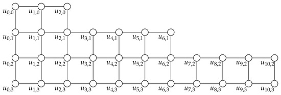 The graph is isomorphic to the staircase graph [30]. The graphs and are isomorphic to the odd staircase graph and the even staircase graph , respectively [31]. Moreover, from [31], we know that for and for any positive number . Now, as an example, we give a visual representation of for and , as shown in Figure 1.