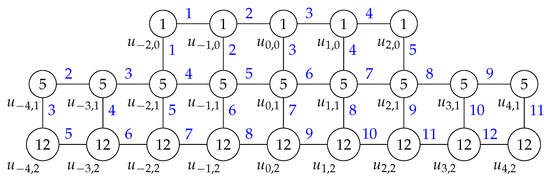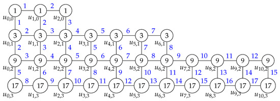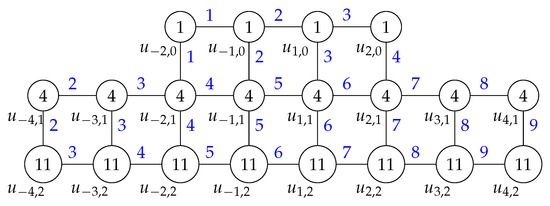As an example of the labeling for the graph given in Theorem 1, we give an example of the labeled graph , as shown in Figure 2. The vertex labels are given inside the circles while the edge labels are given in blue. For the graph , the corresponding value of s is equal to 2.