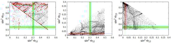 mixing angles for -symmetry; . The shaded areas indicate intervals of the quantities. The red points deviate less than from the experimental values of sin and .