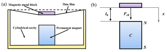 (3) The solid mechanics model of thin-film is added to the magnetic structure, the magnetic-solid coupling simulation model is formed, and the relationship between system stiffness and displacement is given. The impacts of the change of the mass thickness, the radius, and the change of the film thickness on the system stiffness are studied.