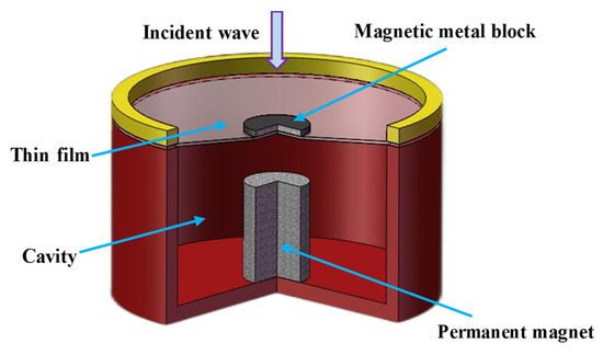 The proposed negative stiffness film structure is composed of the film mass block, the back cavity, and the magnetic attraction structure, as shown in Figure 3. Therefore, the total acoustic impedance expression also includes the acoustic impedance of the film mass block, the acoustic impedance of the cavity part, and the acoustic impedance change , which is caused by the magnetic attraction force: