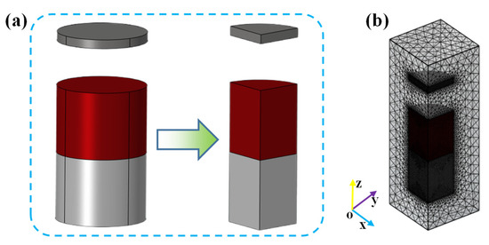 The magnetic field finite element model of the magnetic attraction structure includes the dielectric domain, the mass block, and the permanent magnet. A schematic illustration of the finite element simulation model of the static magnetic field is shown in Figure 4. Obviously, the employed model in Figure 4a is symmetrical, so only one-quarter of the structure is intercepted during the modeling. On top of that, all bodies are divided by tetrahedral elements and free meshes. The XZ plane, YZ plane, and other boundaries of the peripheral dielectric domain are set as the magnetic insulation surface and the upper surface of the permanent magnet as the zero magnetic scalar potential surface. During the process of the simulation, the calculation of the surface stress tensor has to be calculated on all boundaries of the mass block and then integrated to complete the simulation calculation of the force on the mass block. Table 1 presents the geometric structure parameters of the proposed finite element simulation model of the magnetic attraction structure.