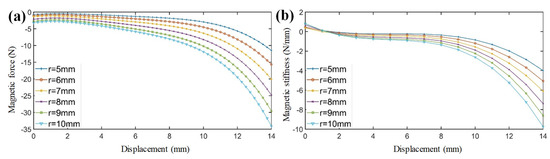 The influence on the radius of the mass block; (a) magnetic force, (b) magnetic stiffness.