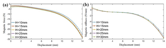 Figure 7 displays the impact on the magnetic force and magnetic stiffness when the thickness of the permanent magnet is increased from 10 mm to 30 mm. As is shown in Figure 7, when the thickness of the permanent magnets increases, the magnetic force and magnetic stiffness do not change significantly. Therefore, the influence of the permanent magnet thickness on the magnetic force can be ignored in subsequent tests.