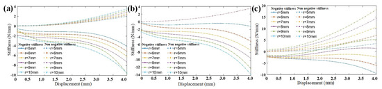 As shown in Figure 9, the addition of the negative stiffness structure significantly reduces the stiffness of the system. Specifically, Figure 9a shows that when the radius of the mass block is increased, the system stiffness of the negative stiffness structure is gradually decreased. In contrast, the system stiffness of the non-negative stiffness structure is changed slightly. As shown in Figure 9b, when the thickness of the mass is increased, the stiffness of the system will be gradually decreased. However, it is found that the impact on the decreased stiffness of the system will be gradually weakened with the increase of the thickness. Additionally, in Figure 9c, when the film thickness is reduced, the system stiffness will also be significantly reduced. In contrast, the influence of the reduced stiffness will not be significantly affected by the reduction of the thickness.
