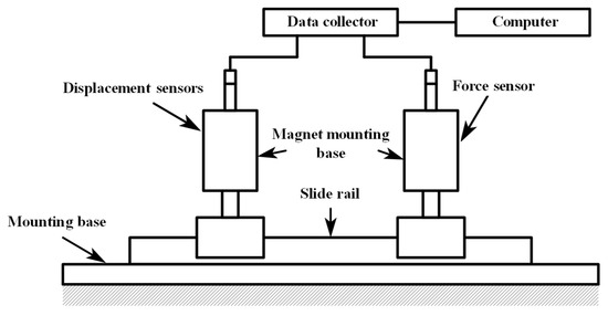 The magnetic force test system of the negative stiffness thin-film structure is shown in Figure 10, whereas the model of the data collector is 3560D. The main components of the magnetic force testing device are the following: mounting base, automatic guide rail, laser displacement sensor (CD22-35), and force sensor (DLLF-88).