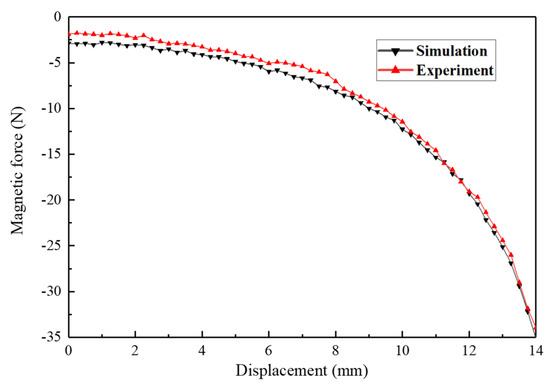 Various structural parameters of the magnetic attraction structure are shown in Table 1. The magnetic attraction structure is tested by using the testing mechanism of the magnetic force, and the magnetic force and displacement curves of the magnetic attraction structure in the range of 0–14 mm spacing are obtained. Figure 11 illustrates the COMSOL static magnetic field simulation results and the magnetic force test results. As can be seen, the displacement-magnetic force curve is obviously nonlinear, and the magnetic force increases with the increase of the displacement. Thereby, the magnetic stiffness is positively correlated with the displacement. Furthermore, it is clear that the experimental curve is in good agreement with the respective simulation curve, which verifies the accuracy of the simulated results. It is worth noting that the experimental curve lies upward compared with the simulation curve. This is due to the friction between the magnet sleeve and the magnet, resulting in errors during the measurements.