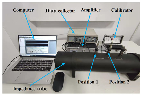 The air sound standing wave tube method is used to test the sound absorption of the negative stiffness thin-film structure, and the test system is shown in Figure 12. Positions 1 and 2 refer to the interfaces of two acoustic sensors, respectively, where the right side is the specimen placement end, and the left side is the sound source. The impedance tube (AWA8551), signal generator (AWA6290M), and power amplifier (AWA5871) are also included. The sound absorption coefficient can be obtained by the following Equation (28):