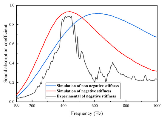 Firstly, the structural parameters of the film structure with negative stiffness are given. The thickness of the film is 0.2 mm, the distance between the mass and the permanent magnet is 10 mm, the depth of the back cavity is 50 mm, and the radius of the back cavity is 45 mm, while other parameters are shown in Table 1. The air acoustic standing wave tube sound absorption test system is used to test the sound absorption of the negative stiffness film structure. The coefficient curve of the sound absorption of the negative stiffness film structure in the frequency band of 100–1000 Hz is obtained. It is compared with theoretical analysis results, as is shown in Figure 13.